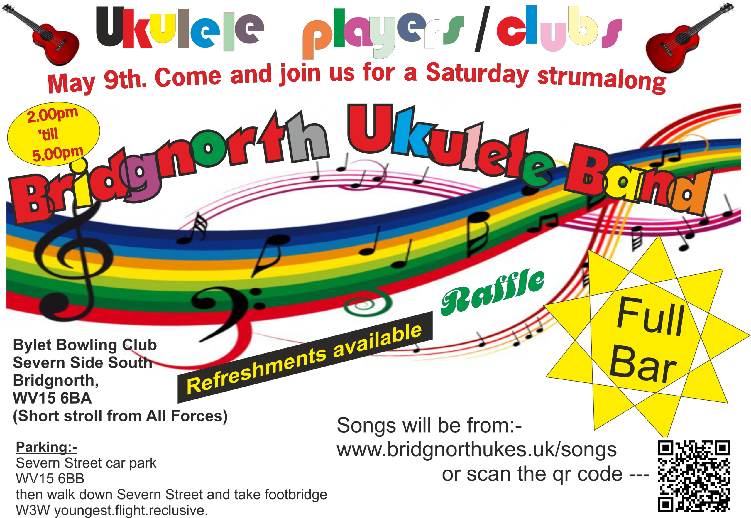 That’s right folks, the sessions that used to be held at Next Door Bar from time to time are now being held at the Bylet Bowls Club. Starting on 9th May when it will be hosted by Bridgnorth Ukulele Club, then subsequently other clubs will be hosting and we will be playing from their songbooks.